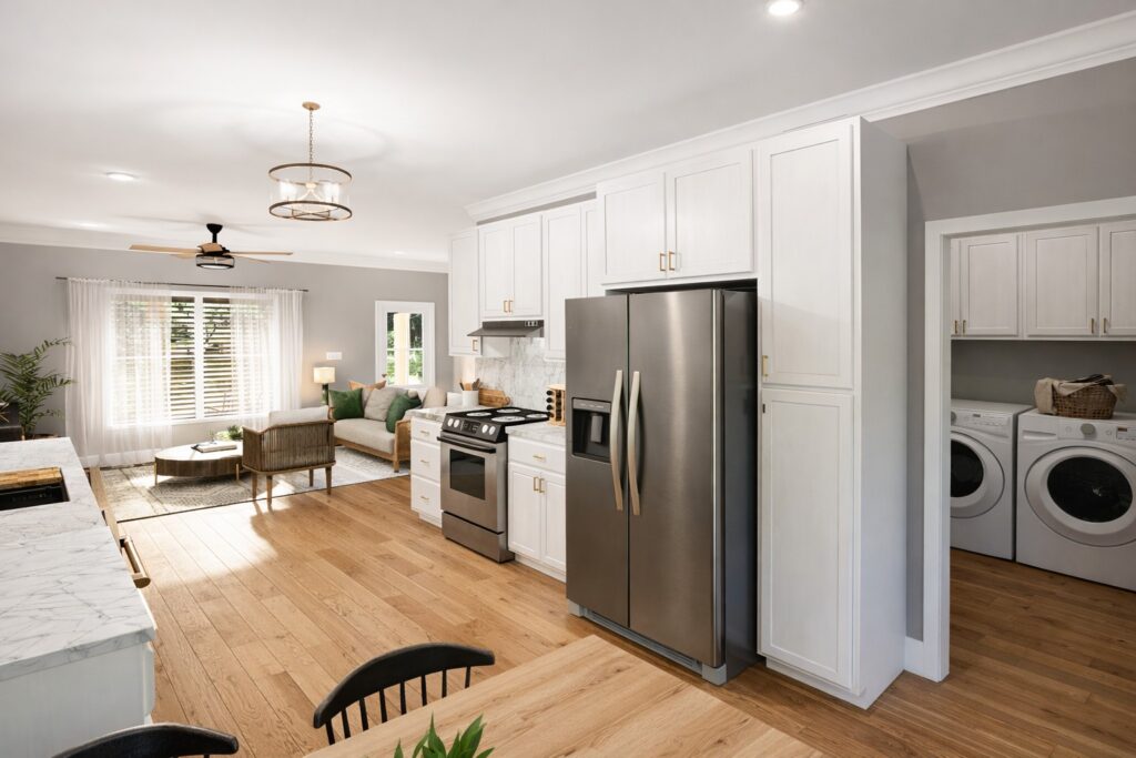 As you enter from a covered front porch, you are greeted by the open Great Room, which serves as the main living area and provides easy access to the kitchen, bedrooms, and hallway. Near the kitchen and hallway is a separate laundry room, keeping washer and dryer access convenient while keeping them out of the main living space. Bedroom 1 features its own private bathroom & walk-in closet, providing the perfect layout for family members who value their own space. Bedroom 2 and Bedroom 3 share a bathroom that includes a tub/shower, vanity and linen area. Bedroom 2 and 3 each have their own walk-in closet and a linen closet conveniently in the hallway for excess storage. A one-car garage connects to the house via a hallway with a coat closet, providing a protected entry, and extra storage, to the home.