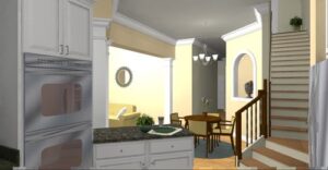 The Kitchen is highlighted with a view into the Great Room and lots of cabinet space. Two niches offer unique angles and extra storage around the angled stairs.