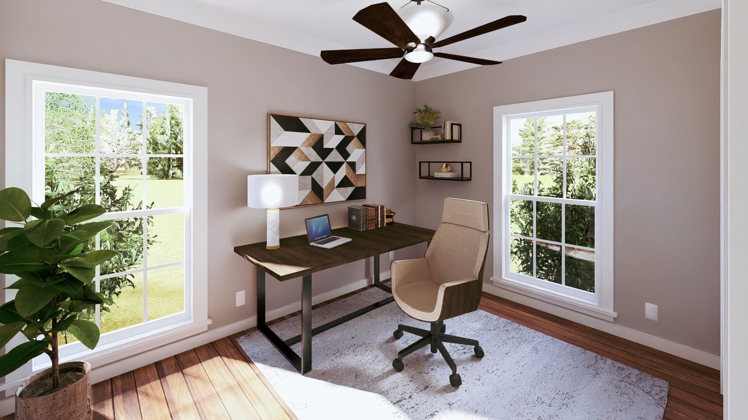 There is a covered porch in the front and back of this home. The dining room is to the left of the entry through the front door. From the dining room, is the Great room, kitchen, and breakfast area which has an open floor plan. The kitchen has an island with seating. All of the bedrooms are in one hall of the home. . The laundry room, pantry and a 1/2 bath are in a hall from the kitchen.