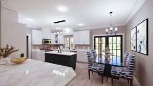 The Kitchen has lots of storage with a long island, dual pantry cabinets, and French doors in the Dining area.