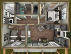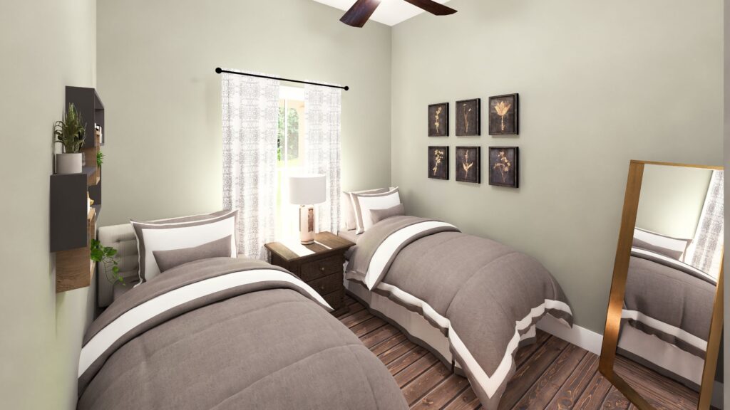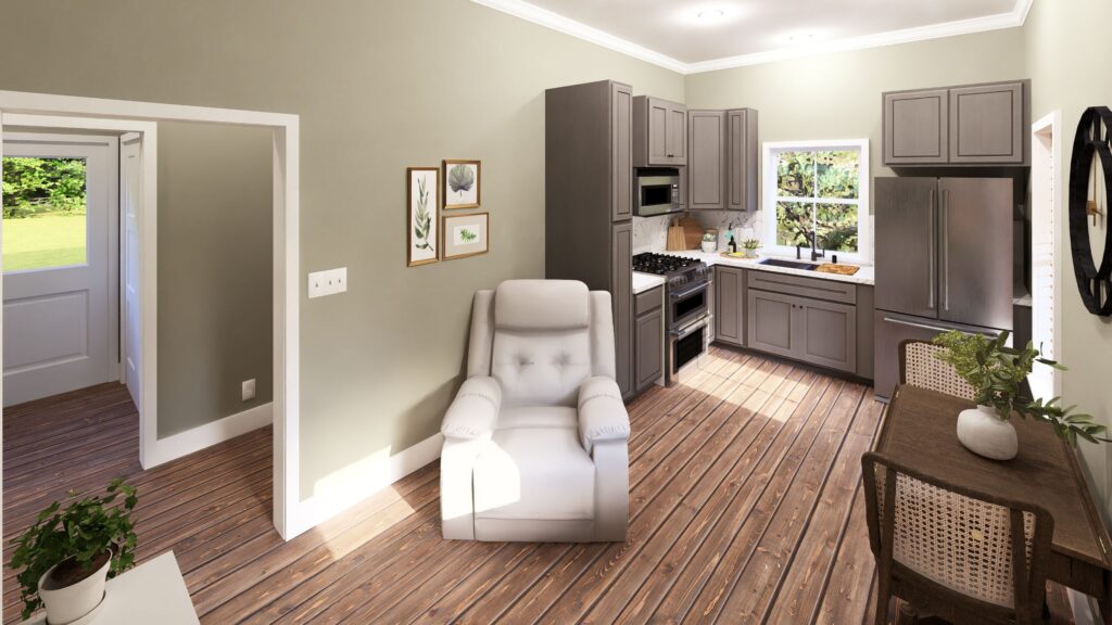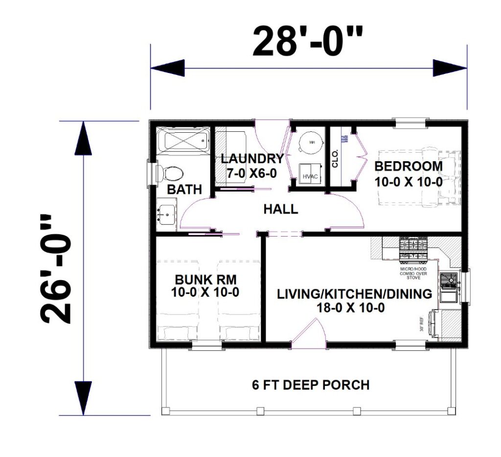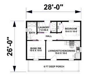 Come explore this thoughtfully designed 28’ wide by 26’ deep home that maximizes comfort and functionality. This 2-Bedroom, 1-Bath layout features an open-floor living space with 10’ main ceilings, creating a bright and inviting atmosphere ideal for everyday living or weekend getaways. The flexible Bunk Room offers additional sleeping space for guests or family, making the home both practical and versatile. A Laundry Room is located within the steps of the Full Bath. A 6’ covered Front Porch extends the living area outdoors, perfect for relaxing or entertaining. Compact yet efficient, this design delivers a smart balance of openness, comfort, and charm.