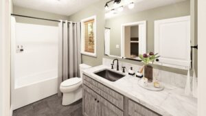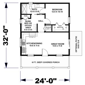 Welcome to this thoughtfully designed 1.5-bedroom home, ideal for first-time buyers, a relaxing getaway, or those looking to downsize in comfort. The inviting 6-foot-deep front porch sets the tone for a warm and welcoming entry. Step inside to the spacious Great Room that flows effortlessly into the Kitchen and Dining area, filled with natural light that enhances the open-concept layout. The Optional Patio extends the Great Room’s living area. An efficient Laundry area is conveniently located in the hall and designed to fit a stacked washer/dryer. The large Bathroom can be accessed directly from the hallway, offering privacy and ease for both guests and residents. The Bedroom features a generous walk-in closet, providing ample storage space. An additional flex space offers the owner’s choice of a Bunk Area or a well-lit Office, complete with a spacious closet—perfect for guests, hobbies, or remote work.