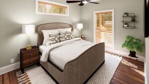 the end of the hall, for privacy. This bathroom has a window for natural light, single vanity and a custom