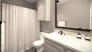 The master bath has dual sinks, a tub/shower combo, a window, and plenty of storage.