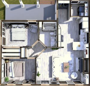 This cozy little cottage has a very inviting 8-foot-deep covered front porch. The great room features a ventless gas fireplace tucked between built-in cabinets. The great room flows seamlessly into the kitchen. There is a snack bar, a convenient size pantry, and upper and lower cabinets in the kitchen for storage. The laundry room is in the rear near the entry. There is also an 8-foot-deep covered porch in the rear providing a more private setting for enjoying fresh air.